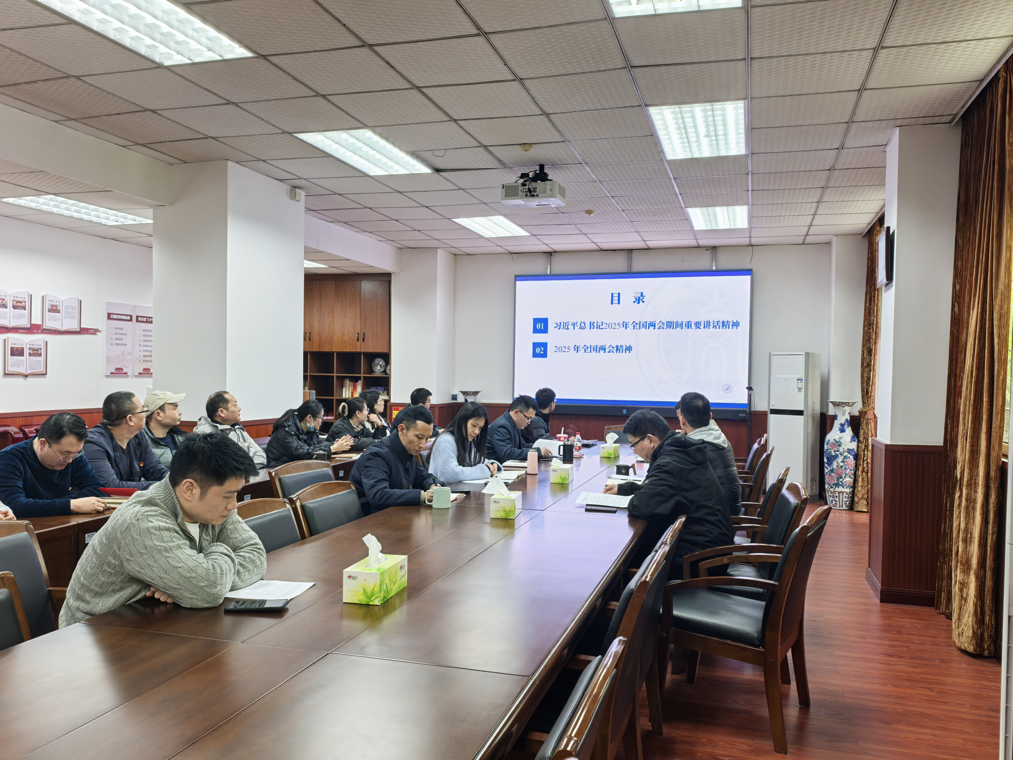 昌子雄领学了习近平总书记2025年全国两会期间重要讲话精神和全国两会精神,系统阐释了习近平总书记在两会期间关于推动科技创新和产业创新融合、强化教育对科技和人才支撑作用等一系列重要论述,深入解读了2025年政府工作报告,重点学习了2025年度政府工作十大任务,并分享了两会期间关于“分类推进高校改革,扎实推进优质本科扩容”的新闻报道。与会人员围绕本次政治理论学习主题展开了热烈讨论。